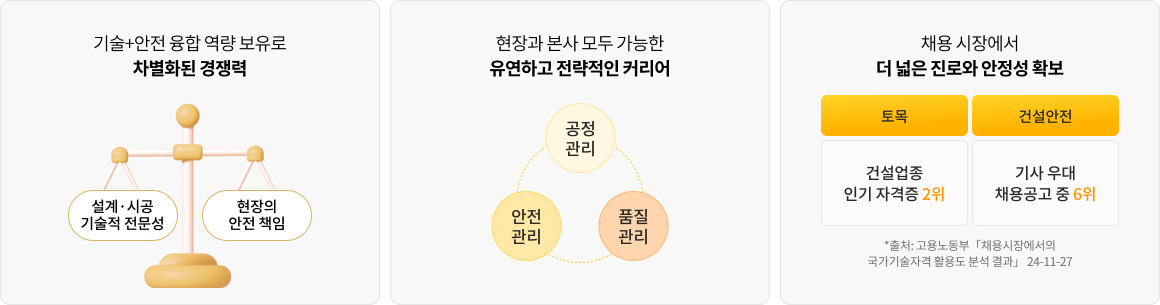 기본 자격은 토목으로, 추가 스펙은 안전으로 쌍기사라면 ‘올라운더 엔지니어’가 될 수 있습니다